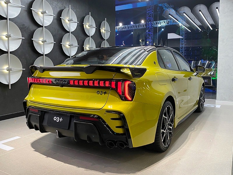 Ngoại hình Lynk & Co 03+ phong cách thể thao với điểm nhấn là cánh gió sau, ống xả kép, cản sau hầm hố.